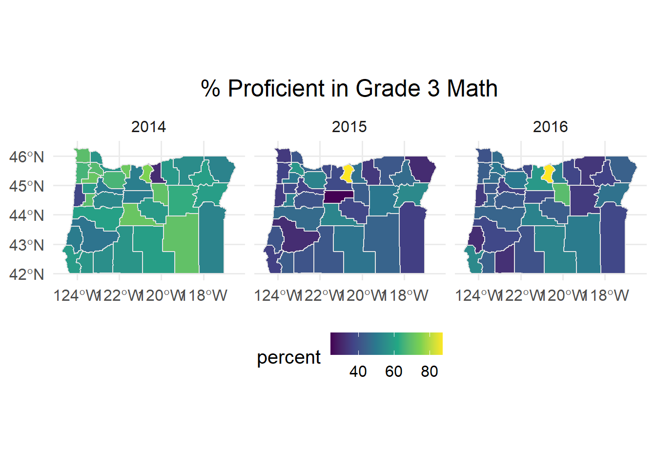 The above displays differences by county across years reported by Kidscount in the percentage of proficient students in math.Reading proficiency among Oregon students in that same year ranges by county from apporximately 47 to 82 percent of third grade students and around 48 to 81 percent of eighth grade students. Gilliam and Lincoln counties appear most consistently with the lowest rates of proficiency across grades and subjects. On the high-achieving end, Sherman County leads across subjects and grades three for four.