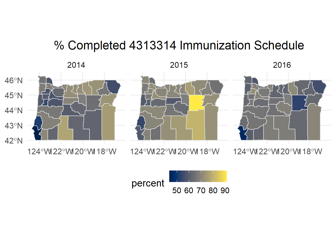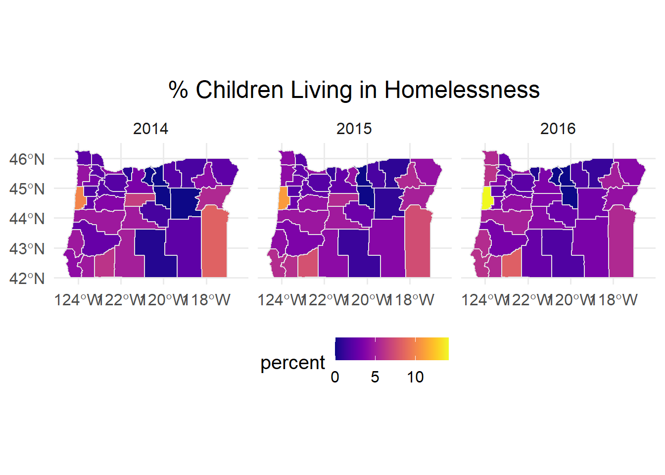 By county, the reported 2016 rates of child homelessness in Oregon range from 0 to 14.2 percent and the rate of children without healthcare runs from 3 to 10 percent. Oregon counties with the lowest rates of child immunization are Curry County with over 56% of children lacking completed immunization schedules and Coos County with over 48% of children in need of updated immunizations. Indicators such as immunization rates show not only an area’s child population’s risk of disease but can also serve as proxy for unobservable information such as a community’s children’s access to adequate healthcare.