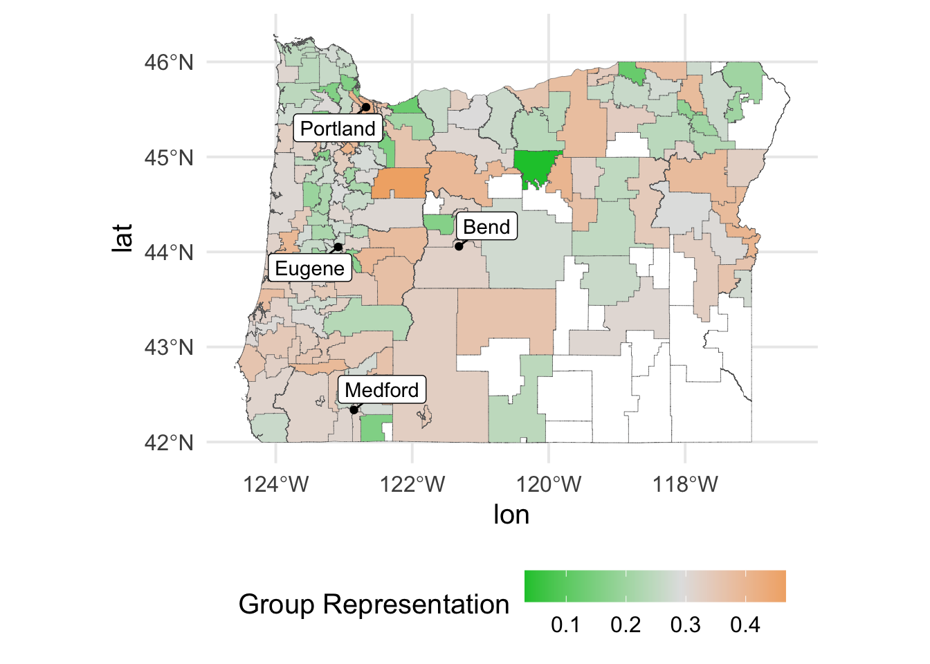 Note that I’ve used a diverging palette to highlight districts with relatively higher or lower economic segregation estimates relative to the overall sample average. It also appears essentially all of our missing data is in the Southeastern part of the state, which is not terrifically surprising given that this is the least densely populated area of Oregon. I’ve annotated the map with a few of the larger cities in Oregon. Overall, there’s surprisingly little pattern here. Perhaps changing the method we use to estimate segregation will change that somewhat, but it is sort of nice to see that, for example, areas of dense population do not necessarily have higher economic segregation rates.