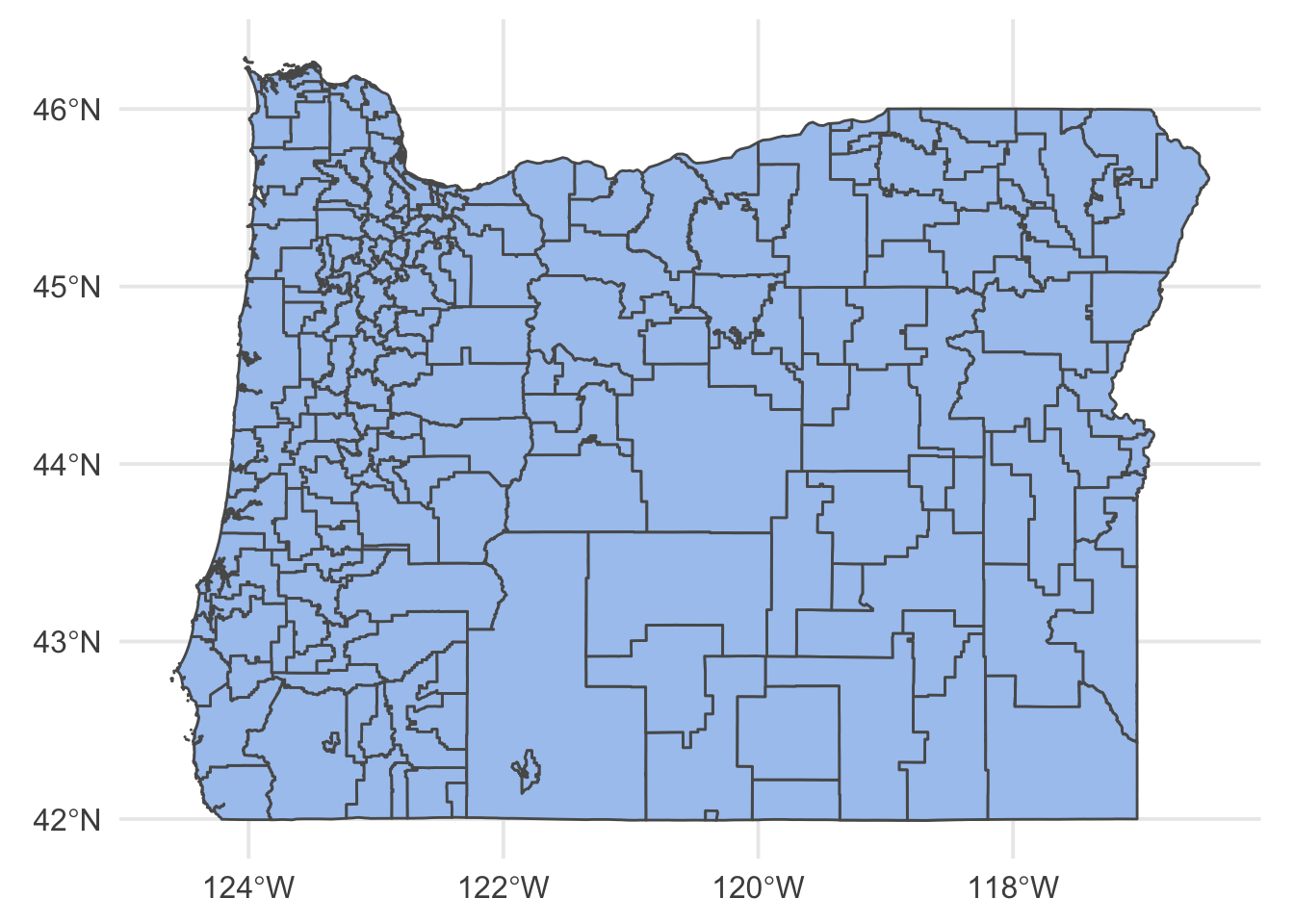 Now we load just the shape file we want, which in this case would, of course, be for Oregon. We have to refer to Oregon through it’s fips code, which for Oregon is 41 (see a complete list here).